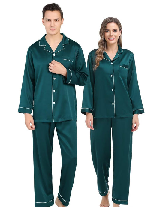 Couples Matching Pajamas Set Silk Satin Long Sleeve Sleepwear Soft Button Down Loungewear Pj Set