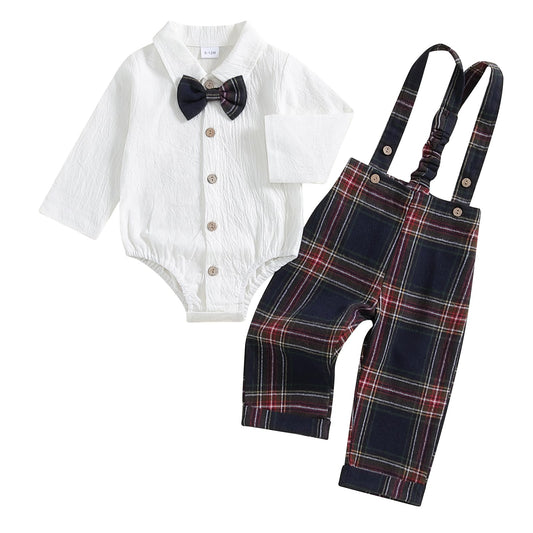 Newborn Baby Boy Gentleman Long Sleeve Bow Tie Romper Plaid Suspender Pants 2Pcs Christmas Clothes Set
