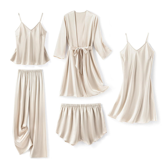 Silk Pajamas for Women 5Pcs Sleepwear Loungewear Satin Robe Cami Shorts Pj Set